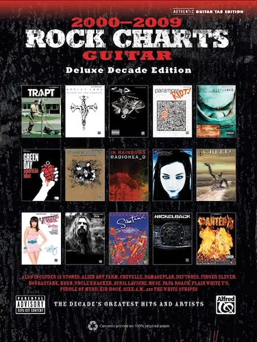 Rock Charts Guitar 2000--2009: Deluxe Decade Edition contains 43 of the biggest hard rock guitar hits from the first decade of the 2000s. Titles: 15 Step (Radiohead) * American Idiot (Green Day) * Believe (Staind) * Blurry (Puddle of Mudd) * Boulevard of Broken Dreams (Green Day) * Bring Me to Life (Evanescence) * Broken (Seether) * Call Me When You’re Sober (Evanescence) * Change (In the House of Flies) (Deftones) * Complicated (Avril Lavigne) * Conquest (The White Stripes) * Down with the Sickness (Disturbed) * Fake It (Seether) * Far Away (12 Stones) * Follow Me (Uncle Kracker) * Foxy Foxy (Rob Zombie) * Freak on a Leash (Korn) * Gotta Be Somebody (Nickelback) * Headstrong (Trapt) * Hey There Delilah (Plain White T's) * Higher (Creed) * I Kissed a Girl (Katy Perry) * If Today Was Your Last Day (Nickelback) * Last Resort (Papa Roach) * Life Is Beautiful (Sixx:A.M.) * Misery Business (Paramore) * One Thing (Finger Eleven) * Only God Knows Why (Kid Rock) * Paralyzer (Finger Eleven) * Psycho (Puddle of Mudd) * The Reason (Hoobastank) * Remedy (Seether) * Revolution Is My Name (Pantera) * Rockstar (Nickelback) * Saints of Los Angeles (Mötley Crüe) * Save Me (Damageplan) * Send the Pain Below (Chevelle) * Smooth (Santana) * Smooth Criminal (Alien Ant Farm) * So Far Away (Staind) * Stricken (Disturbed) * Supermassive Black Hole (Muse) * With Arms Wide Open (Creed).