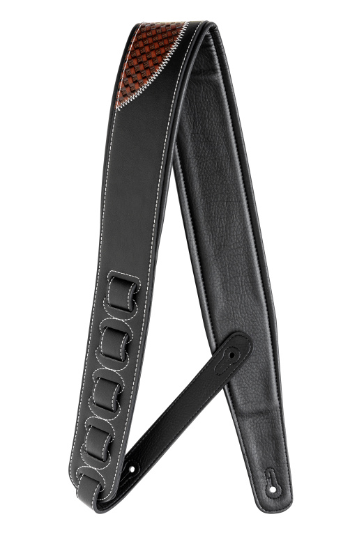 Black padded leatherette guitar strap with dark brown guitar shape